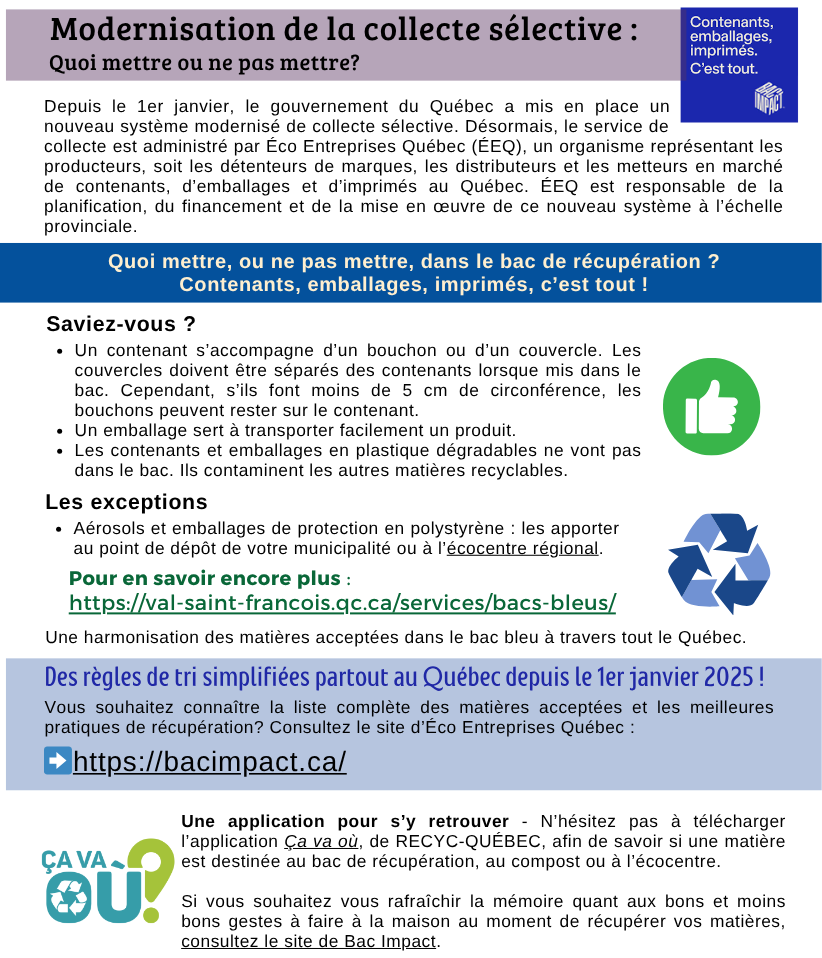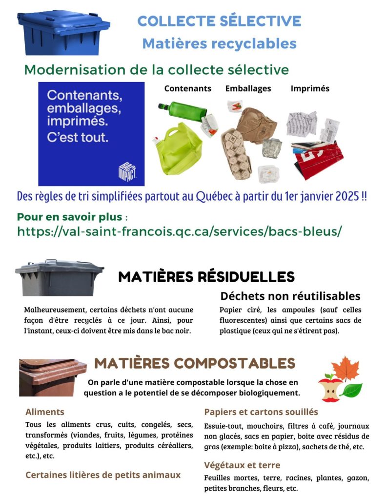 Aussi, il est important de bien s’informer avant de mettre vos gros rebuts sur le bord de la route. Plusieurs items (gallons de peinture vides, pneus, appareils électroniques, etc.) ne doivent pas être déposés avec les gros rebuts de tous genres car ces items ne seront pas ramassés et seront laissés sur le bord de la route. Nous vous invitons à trier et apporter ces items à l’écocentre ou dans des commerces participants afin d’en disposer de manière sécuritaire pour l’environnement. Il est primordial que tous fassent leur devoir et nous comprenons que cela demande un effort supplémentaire, mais il s’agit d’un geste écologique primordial à la préservation de notre belle planète.