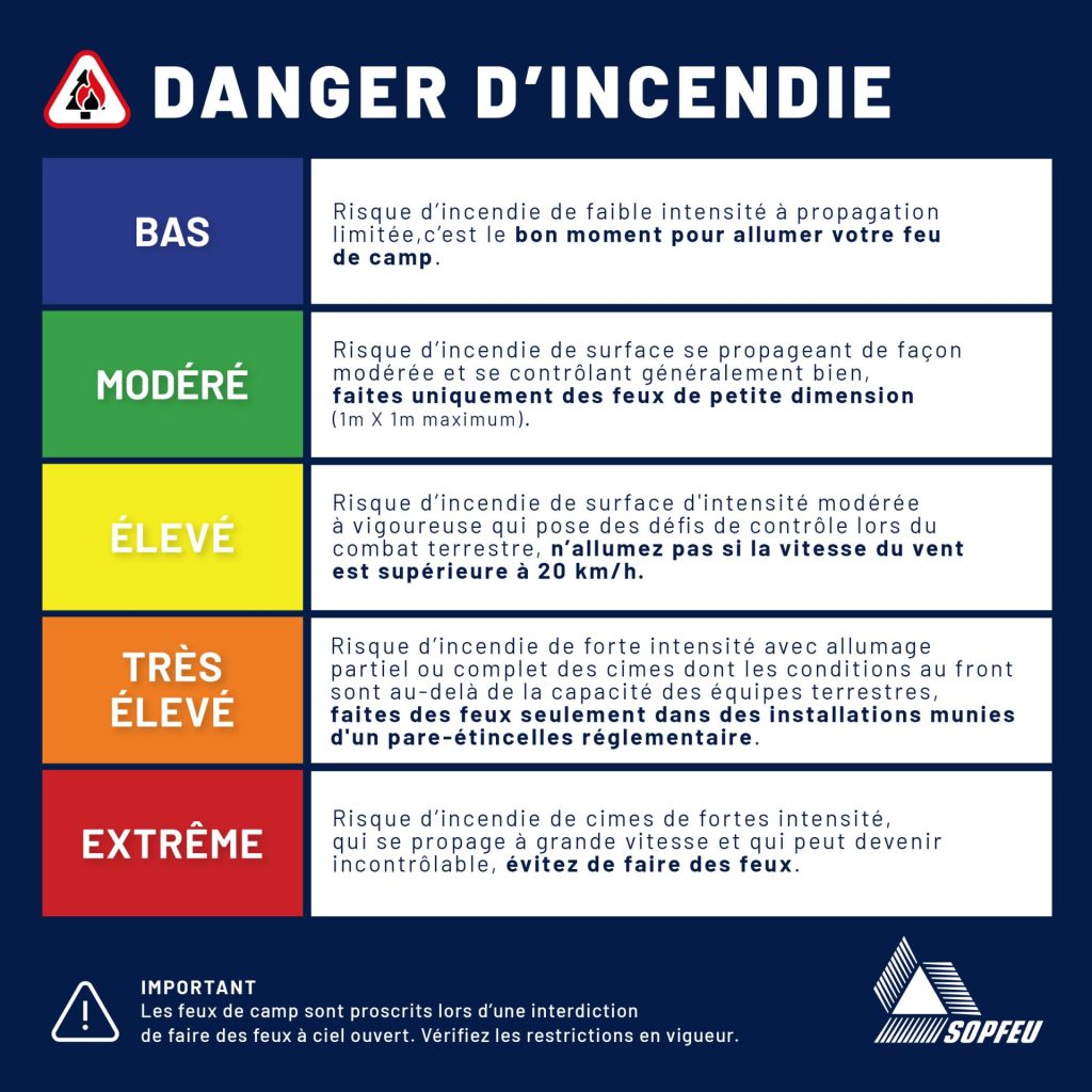 Assurez-vous de noter le degré de danger d’incendie avant de commencer à remplir le formulaire de demande pour permis de feu ! Pour un feu prévu le lendemain ou le surlendemain, consultez le site de la Sopfeu.